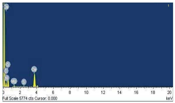 活性炭的表面化學成分是通過使用能量色散X射線(EDX)光譜確定的。得到的光譜見圖2,C、N、0、Mg、Ca的百分比分別為7.64%、14.53%、35.31%、0.70%、41.80%。FTIR結果支持C、N和O的存在,該結果表明存在羰基和胺基團。除此之外,高百分比的Ca表明主要是鈣的性質(zhì)。此外,光譜中出現(xiàn)Mg表明Mg化合物與碳和氧強烈結合。因此,無論是用熱蒸餾水還是冷蒸餾水,都不容易通過洗滌去除。