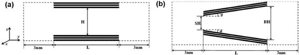 狹縫孔由半有限狹縫孔由兩個(gè)平行的石墨壁組成。每個(gè)壁包含三個(gè)石墨烯層,如圖1(a)所示。框的虛線表示模擬框在y和z方向上的邊界。周期性邊界條件僅適用于x方向。兩個(gè)開口端與大塊氣藏相連,每個(gè)氣藏沿y軸的長度為3nm,孔隙寬度決定了z方向的尺寸。因此,通過孔內(nèi)分子與體相的相互作用,可以在孔和周圍環(huán)境之間保持機(jī)械平衡?讖紿是指通過一個(gè)壁最內(nèi)層中碳原子中心的平面與相對壁的相應(yīng)平面之間的距離。楔形孔在圖1(b)描繪了一個(gè)開放的楔形孔及其結(jié)構(gòu)參數(shù):小端(SH)和大端(BH)的孔徑,軸向孔長(L)和半角(α)?虻奶摼表示模擬框在y和z方向上的邊界。與狹縫孔一樣,開口端周圍的氣體沿y軸的長度為3nm,大端的寬度決定了z方向的尺寸。沿軸向(即,y方向)的孔長度是有限的L,而在x方向上的尺寸在應(yīng)用周期性邊界條件的情況下假定為無限。