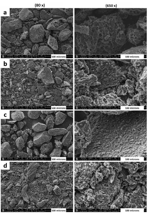 我們使用現(xiàn)代分析技術(shù)來(lái)了解制備的活性炭催化劑的真實(shí)性質(zhì),掃描電子顯微鏡(SEM)是查看材料形態(tài)的強(qiáng)大工具。圖1顯示了四種活性炭樣品的SEM圖像。圖像是在兩個(gè)不同的分辨率,以比較不同比例的樣本。評(píng)估不同煅燒溫度的影響是很重要的。圖1的左側(cè)圖像顯示,無(wú)論煅燒溫度如何,所有樣品的表面都被各種亞微米大小的顆粒所掩蓋,并且表面上存在許多明顯的解理。不同煅燒溫度下的熱解對(duì)活性炭樣品的形貌影響不大,但有輕微的變化,如一些顆粒從表面被去除,一些解理被侵蝕。此外,從這些SEM圖像可以推斷,這些活性炭材料中的許多微孔結(jié)構(gòu)使其成為任何化學(xué)反應(yīng)中反應(yīng)物相互作用的極好載體。