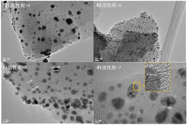 為了進(jìn)一步研究金顆粒在活性炭表面的分布和結(jié)晶度,我們拍攝了鍍金活性炭樣品的透射電子顯微鏡圖像。圖7顯示了各種活性炭樣品在不同放大倍數(shù)下的TEM圖像。圖2a、b顯示了金納米粒子在活性炭表面上的分布。很明顯,兩個(gè)樣本的分布是均勻的;钚蕴-4和活性炭-6似乎都以類(lèi)似的方式相互作用和承載金納米粒子;钚蕴-7樣品的高分辨率TEM圖像如圖2c、d所示。圖2c顯示大多數(shù)金納米顆粒很小,直徑為3-5nm,并且只能看到少數(shù)團(tuán)聚顆粒。圖2d顯示了金的晶格條紋間距。發(fā)現(xiàn)晶格條紋間距為0.217nm,對(duì)應(yīng)于金晶面的面。此外,我們?cè)噲D通過(guò)TEM圖像估計(jì)顆粒尺寸的分布,我們發(fā)現(xiàn)所有樣品中超過(guò)80%的金顆粒的尺寸小于5nm。