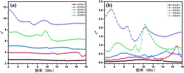 圖3:(a)載鉬活性炭-石蠟復(fù)合材料的相對復(fù)介電常數(shù)的實(shí)部和虛部,填充量從10%到50%不等。