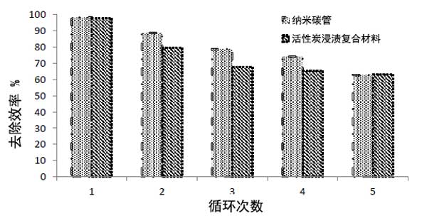 活性炭復合材料的再生具有經(jīng)濟重要性。該實驗涉及許多吸附-解吸循環(huán),以估計重復脫色對納米材料吸附效率的影響。發(fā)現(xiàn)納米碳管和活性炭浸漬材料對活性紅的去除效率略有變化,如圖3所示。數(shù)據(jù)顯示原始納米碳管和活性炭浸漬材料存在差異與不同初始活性紅染料濃度下重復使用的納米化合物相比;钚约t的吸收程度在第一個循環(huán)后達到98.18%,然后在五輪納米碳管后降低到62.72%,而對于活性炭浸漬材料,第一個循環(huán)去除效率為97.72%,在第一個循環(huán)后,在五輪后降低到63.18%,表明其再生有效性,如圖3所示。因此,可以得出結(jié)論,納米碳管和活性炭浸漬材料的吸附過程會受到延長重復使用周期的影響,而不會損失大量染料吸附能力。因此,兩種納米化合物被多次用于從水性階段去除活性紅染料。因此,這表明它們可以多次使用,證明了它們的經(jīng)濟可行性。