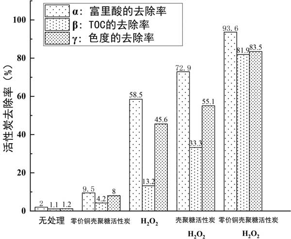 富里酸、TOC、色度的去除率分別以α、β、γ表示,如圖2所示 。從圖中可以看出,氧化劑H 2 O 2 的加入是至關(guān)重要的。實驗組用H 2 Ø 2倍加有較好的去除富里酸,TOC和色度相比,有活性炭催化劑的組比沒有催化劑的組實現(xiàn)了更高的去除率。三個指標(biāo)的去除率都有所提高,尤其是TOC的去除率明顯提高,從13.2%提高到81.9%,說明零價銅的加入可以大大提高催化濕氧化法反應(yīng)中富里酸的礦化率。相同條件下,礦化率比無零價銅實驗組高近2.5倍。零價銅對富里酸降解和脫色也有明顯效果。結(jié)果表明,本研究制備的零價銅殼聚糖活性炭催化劑對富里酸去除和有機化合物礦化具有較高的催化活性。