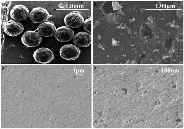 SEM被用于研究活性炭的形態(tài)、表面粗糙度和粒度。其內(nèi)部孔隙結(jié)構(gòu)信息也可以通過橫截面的SEM進(jìn)行分析。SEM圖像顯示球型活性炭具有均勻的球形,粒徑(直徑)約為600μm(圖1a)。表面比較光滑,有較大的裂紋和孔隙結(jié)構(gòu),表面有許多無序的微晶結(jié)構(gòu)(圖1b)。橫截面顯示了一些分布均勻的相對(duì)均勻的孔隙(圖1c和1d)。