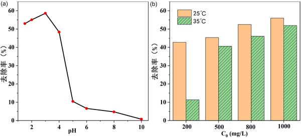 溫度也影響吸附過程?疾炝瞬煌瑴囟认虏煌瑵舛却姿崛芤旱奈竭^程,其他條件不變。結(jié)果如圖2(b)所示。對(duì)于不同濃度的乙酸稀釋劑,25℃時(shí)的吸附去除率高于35℃時(shí)的吸附去除率,表明吸附過程是放熱的。因此進(jìn)一步的實(shí)驗(yàn)僅在25℃下進(jìn)行。對(duì)于工業(yè)應(yīng)用,室溫條件是可行的,無需提供額外的熱源。