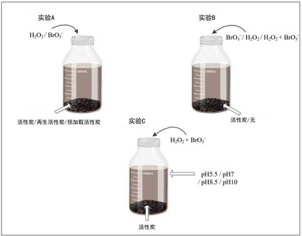 在對(duì)50家飲用水公用設(shè)施進(jìn)行的調(diào)查中,獲得過氧化氫和溴化物的平均值來當(dāng)做測(cè)試用水。在所有實(shí)驗(yàn)中,批量反應(yīng)器都用薄箔包裹。制備0.052µmol/L溴酸鈉溶液并加入間歇反應(yīng)器中以獲得0.5µmol/L溴酸鹽的濃度。高級(jí)氧化工藝中的出水殘留過氧化氫濃度不會(huì)超過180µmol/L。因此,在本研究中,將150µmol/過氧化氫加入到間歇式反應(yīng)器中。如圖1所示,在23–27℃的環(huán)境溫度下,使用36個(gè)批次玻璃瓶進(jìn)行了一系列實(shí)驗(yàn);钚蕴坑昧渴冀K為5g/L,過氧化氫和溴酸鹽濃度始終分別為150µmol/L和0.5µmol/L。所有裝有過氧化氫的間歇式反應(yīng)器都用鋁箔覆蓋,以防止過氧化氫被光潛在降解。在如圖1所示的實(shí)驗(yàn)中,使用16個(gè)間歇式反應(yīng)器和三種不同的活性炭(活性炭、再生活性炭和預(yù)加載活性炭)來研究不同運(yùn)行時(shí)間的活性炭對(duì)溴酸鹽和過氧化氫的去除,該實(shí)驗(yàn)涉及八個(gè)處理組。