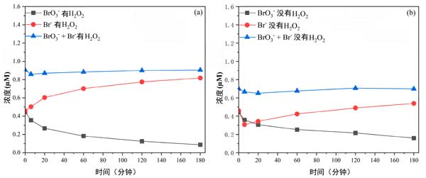 圖3:各種溴酸鹽與不存在和存在過氧化氫的情況下的濃度(a)有過氧化氫,(b)沒有過氧化氫。