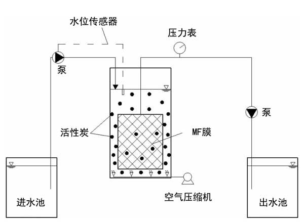 圖1:實(shí)驗(yàn)室規(guī)模的浸沒式膜過濾系統(tǒng)示意圖。