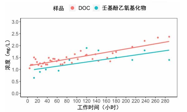 圖3:運(yùn)行期間滲透液中DOC和壬基酚乙氧基化物濃度的變化。