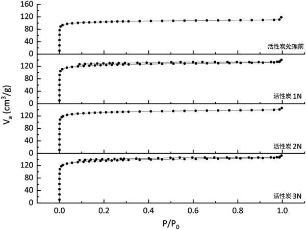 使用BET法的氮?dú)馕锢砦椒治鰞x確定吸附劑吸附等溫線并測(cè)量比表面積和孔體積。等溫曲線如圖1所示。圖1顯示處理前后的所有活性炭均為I型等溫線。I型等溫線表明吸附劑通常是微孔的,暴露的表面幾乎完全位于微孔內(nèi)部,幾乎沒有或沒有外表面可供進(jìn)一步吸附一次充滿吸附質(zhì)。I型向P/P0軸凹,吸附量達(dá)到極限值(P/P0→1)P/P0是相對(duì)壓力,它是吸附氣體平衡壓力與其飽和平衡蒸汽壓力的比值。圖1中清楚地描述了酸處理可以增加吸附氮?dú)獾捏w積,這表明增加的孔體積。