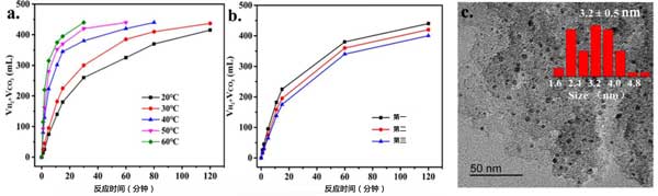圖3:(a)在不同反應溫度下由活性炭載鈀催化的總體積(H2+CO2)生成和(b)甲酸分解的穩(wěn)定性測試。(c)回收的活性炭催化劑TEM顯微照片和粒度分布。