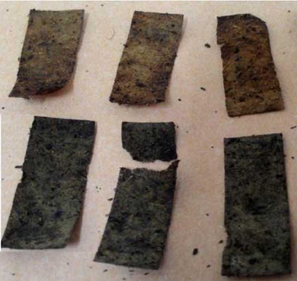在觀察結(jié)束時,與不含納米活性炭的紙張相比,含納米活性炭的紙張降解更徹底,物理結(jié)構(gòu)更脆。大約50%的活性炭紙被完全降解,同時在土壤試塊生物降解試驗(yàn)中只有1個纖維素紙被完全降解。觀察12周后的紙張外觀如圖2所示。但是,紙張的降解能力也受紙張類型的影響。以往對各類紙張的生物降解性的研究結(jié)果表明,不同類型的紙張在受控條件下具有不同的生物降解性。研究發(fā)現(xiàn),除非改變制造工藝,否則報紙和紙巾/紙手帕更難生物降解。