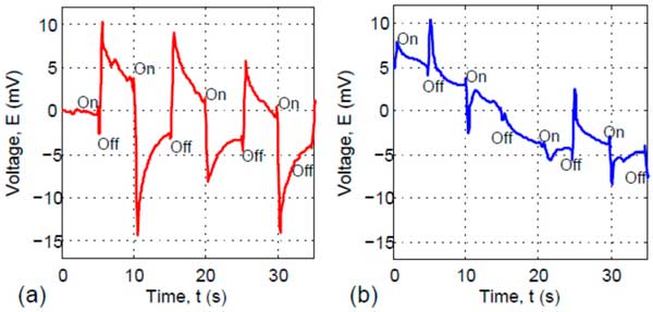 圖2:含鈦酸鈷(II)顆粒的復合活性炭(a)和含二氧化鈦顆粒的復合碳纖維(b)的開路電壓。
