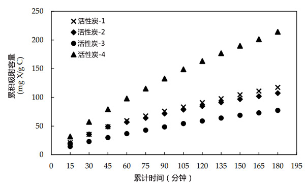活性炭是去除有機(jī)物的常用吸附劑。吸附性能主要取決于其比表面積和微孔結(jié)構(gòu)。它們具有較高的內(nèi)部孔隙率,因此具有較高的吸附性。在本研究中,對(duì)四種具有不同表面性質(zhì)的顆;钚蕴繕悠(活性炭-1、2、3和4)進(jìn)行了去除黃藥的測(cè)試。將兩克活性炭樣品與50毫升1590毫克/升的黃藥溶液混合15分鐘。過(guò)濾活性炭,并用紫外-可見(jiàn)光譜法測(cè)量溶液中的殘余黃藥。通過(guò)重復(fù)使用碳樣品,重復(fù)該程序12次,以達(dá)到大吸附量。如圖1所示,活性炭-4的吸附容量比較高,因此選擇其進(jìn)行進(jìn)一步研究。