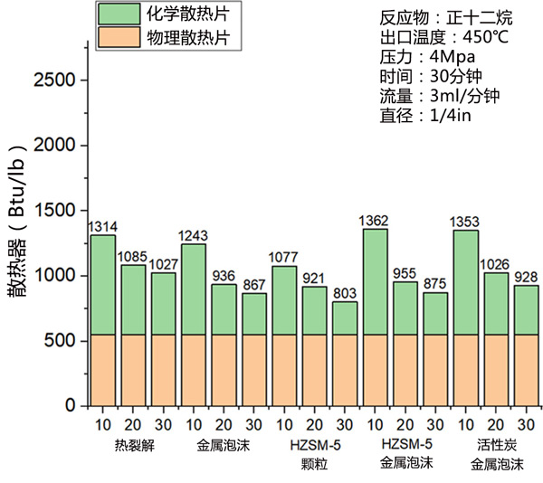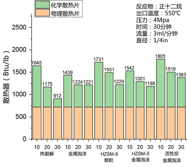 熱裂解和催化裂解產生的散熱片-十二烷在圖2顯示,溫度為450℃,壓力為4MPa。由于散熱器與使用的飛機冷卻技術直接相關,因此應慎重考慮。測量的散熱器值在10分鐘內取平均值,通過將它們除以質量流量將瓦特轉換為Btu/lb單位。反應10分鐘后,HZSM-5/金屬泡沫和活性炭/金屬泡沫樣品的散熱片分別為1342和1353Btu/lb。兩種催化劑在10分鐘內都表現(xiàn)出高散熱片。僅金屬泡沫和HZSM-5顆粒的初始散熱器分別為1243和1077Btu/lb。僅涉及金屬泡沫的反應的熱沉低于熱裂解的熱沉。由于反應溫度低,泡沫不作為金屬催化劑并占據(jù)反應空間30分鐘。HZSM-5顆粒在反應的前30分鐘內導致最低的熱沉,因為氣體產率低且產生大量線性石蠟。相比之下,熱裂化的散熱器保持在高值30分鐘。因此,在低反應溫度下,酸和金屬催化劑均表現(xiàn)出低催化效率并占據(jù)反應空間。