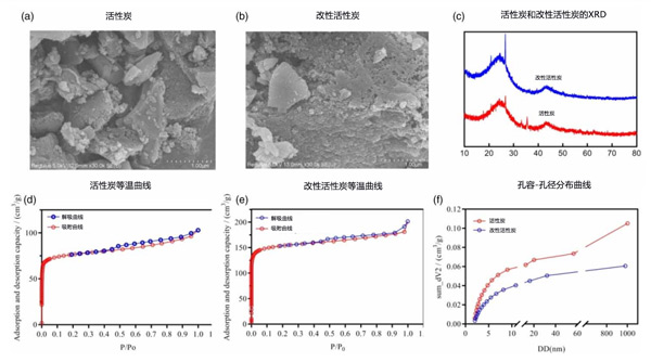 當(dāng)原活性炭經(jīng)受0.1mol/L、0.5mol/L和0.8mol/L高錳酸鹽,煅燒溫度為400℃、500℃、800℃,煅燒時(shí)間為2小時(shí),5小時(shí)和7小時(shí)。通過三因素三水平正交試驗(yàn)和極差分析篩選出改性活性炭的合適組合。改性后觀察到活性炭表面形態(tài)發(fā)生顯著變化,分別如圖1(b)所示。改性前的活性炭表面有較大的團(tuán)聚顆粒,表面沒有明顯的孔隙結(jié)構(gòu)。改性后表面粗糙,呈不規(guī)則凸起的刺狀顆粒結(jié)構(gòu),孔隙結(jié)構(gòu)發(fā)達(dá)。改性前后活性炭的XRD圖如圖1(c)所示;钚蕴扛男郧昂蟮姆逍蜗嗨,但一些峰出現(xiàn),另一些峰消失。圖1(d)和1(e)分別顯示了活性炭改性前后的吸附和解吸等溫線。它們整體呈隨P/P0增加的趨勢(shì),吸附量增加,但在相同情況下,改性活性炭的吸附能力更強(qiáng)。圖1(f)為改性前后活性炭的孔容孔徑分布,改性后的活性炭孔體積更大。改性活性炭的比表面積是活性炭的兩倍,累積吸附總孔體積是活性炭的1.72倍。