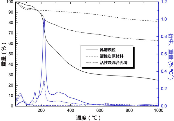 由于這種粘合劑對于這一特定應(yīng)用的新穎性,有必要首先研究原料顆粒的碳化。圖2顯示了在非氧化氣氛下活性炭前體和僅有粘合劑的生粒料在非氧化氣氛下的熱行為。椰殼炭在所研究的溫度范圍內(nèi)非常穩(wěn)定,在1000℃時僅減輕17.7%的重量,其中幾乎一半(8%)對應(yīng)于水分的釋放;钚蕴壳绑w的這種低揮發(fā)性排放形成對比。在相同溫度下觀察到乳清重量損失70%。這意味著焦炭產(chǎn)量約為。30%的乳清粘合劑在1000℃。乳清顆粒的大部分揮發(fā)性排放發(fā)生在低于600℃的溫度下,在175至275℃之間觀察到大量重量損失。在類似條件下獲得的純α-乳糖或乳清蛋白的熱曲線中不存在這種熱事件。據(jù)推測,這種特殊的熱行為可能是美拉德聚合物或樹脂的特征。這種新粘合劑的其他次要事件歸因于結(jié)晶α-乳糖的脫水等。