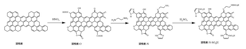 以活性炭為原料,用HNO3氧化,用乙二胺胺化。得到的中間體用硫酸水溶液處理以產(chǎn)生硫酸氫活性炭催化劑。通過過濾分離產(chǎn)物并在105℃干燥24小時(shí)。活性炭的具體制備方案如圖1所示。