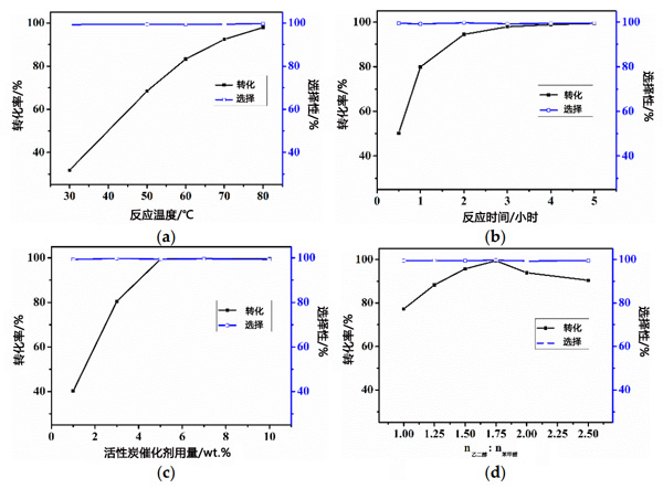 為了確定活性炭的催化性能,討論了反應(yīng)溫度、反應(yīng)時(shí)間、催化劑用量和醇/醛摩爾比對苯甲醛轉(zhuǎn)化率的影響。測試結(jié)果如圖2a-d所示。結(jié)果表明,隨著反應(yīng)溫度、反應(yīng)時(shí)間和催化劑用量的增加,苯甲醛轉(zhuǎn)化率逐漸升高,直至反應(yīng)溫度達(dá)到80℃,反應(yīng)時(shí)間達(dá)到5小時(shí),催化劑用量為苯甲醛質(zhì)量的5%。在上述條件下,苯甲醛轉(zhuǎn)化率在99%以上。當(dāng)醇/醛的摩爾比低于1.75時(shí),苯甲醛的轉(zhuǎn)化率隨著乙烯醇的增加而逐漸增加。當(dāng)乙二醇用量繼續(xù)增加時(shí),苯甲醛轉(zhuǎn)化率有一定程度的下降。苯甲醛轉(zhuǎn)化率降低的主要原因是隨著乙二醇用量的增加,反應(yīng)體系中苯甲醛的濃度降低,導(dǎo)致分子間的碰撞減少。在所有條件下,苯甲醛乙二醇縮醛的選擇性均在99%以上,表明存在競爭催化機(jī)制。