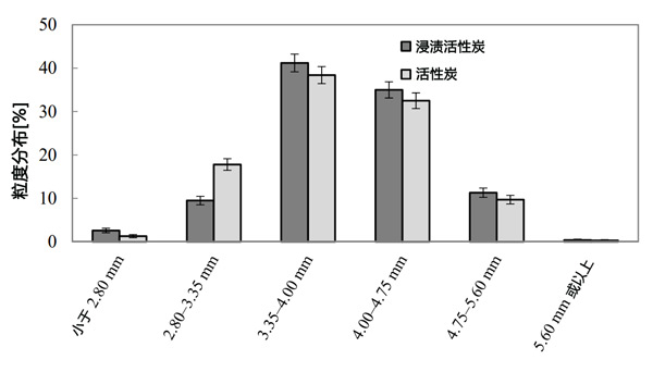 在一系列實(shí)驗(yàn)中使用了用碘酸和無機(jī)酸浸漬的顆;钚蕴俊8鶕(jù)測量粒度分布、堆積密度和甲苯吸附能力,和測量浸漬活性炭的pH值。粒度按篩子大小分類。通過測量包裝在200mL容器中的浸漬活性炭的重量來計(jì)算堆積密度。通過將1/10甲苯蒸氣流到10g浸漬活性炭中,測量甲苯蒸氣吸附前后的重量差,計(jì)算出甲苯吸附容量。將3g浸漬活性炭加入300mL離子交換水中并搖動30分鐘,制成活性炭樣品再進(jìn)行pH測量。圖1顯示了浸漬活性炭和活性炭的粒度分布。對于浸漬活性炭和活性炭,粒徑均為2.80-5.60毫米。這些粒徑通常是氣體處理的值。通過浸漬,堆積密度增加,甲苯吸附能力降低。這可能是由于浸漬材料滲入了孔隙。由于金屬的雜質(zhì),活性炭的pH值呈堿性。由于酸解離,通過浸漬降低了pH值。