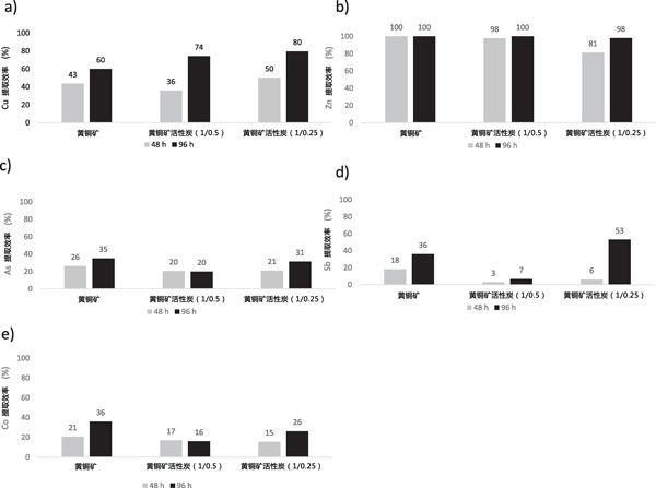 金屬對(duì)世界社會(huì)、經(jīng)濟(jì)和工業(yè)至關(guān)重要。按全球產(chǎn)量計(jì)算,銅是繼鐵和鋁之后的第三大金屬。它被廣泛用于電氣、電子和通信應(yīng)用。圖1顯示了Cu、Zn、As、Sb和Co的提取率。在銅提取的情況下,48小時(shí)后,以1/0.25的比例添加活性炭增加了銅提取量(與對(duì)照條件相比),而以1/0.5的比例添加導(dǎo)致銅提取量略有下降提取的銅。浸出96小時(shí)后,活性炭的催化效果更加明顯,當(dāng)活性炭以1/0.25的比例加入時(shí),提取率最高,達(dá)到80wt%。銅的提取主要受浸出液的氧化還原電位控制,這與Fe3+/Fe2+密切相關(guān)。濃度比,并且在低氧化還原電位值時(shí)由于中間物質(zhì)的形成而增強(qiáng),然后容易被氧化。當(dāng)以1/0.25的活性炭質(zhì)量比添加活性炭催化劑時(shí),Co的浸出率在控制條件下(96小時(shí)后為36wt%)進(jìn)一步降低至26和16wt%(96小時(shí)后和1/0.5,分別(見(jiàn)圖1e)。