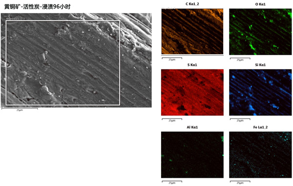 圖2:浸出96小時(shí)后活性炭/黃銅礦殘?jiān)腟EM-EDS圖像。
