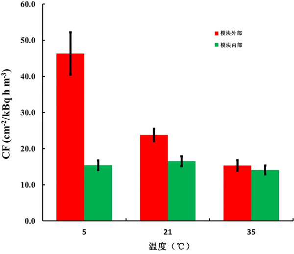 對于實驗,使用三種活性炭的織物為探測器設計了單獨的模塊。對于前兩種活性炭,模塊是HDPE,對于第三種活性炭,模塊是LDPE。單獨設計遵循上述方法,考慮到每種活性炭織物的確切單獨質(zhì)量。在所有設計中,不同溫度下的k(T)值根據(jù)方程式計算;钚蕴康慕Y(jié)果如圖2所示。5℃時的CF0比35℃時的CF0高305%。相比之下,對于放置在補償模塊中的傳感器,CF的變化在17%以內(nèi)(最大值/最小值=1.17)。值得注意的是,在模塊內(nèi)部不同溫度下暴露的傳感器的CF之間的配差異在95%的顯著性水平上沒有統(tǒng)計學意義。發(fā)現(xiàn)所描述的帶有補償模塊的探測器的CF明顯高于其他常用的無源氡探測器。