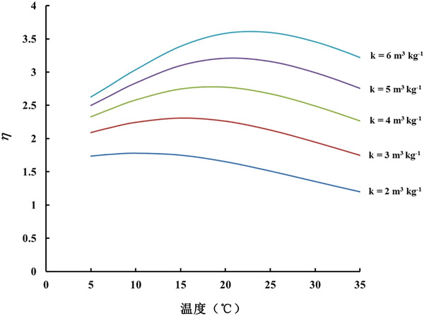 查看活性炭的檢測器的結(jié)果(圖2)可以看出,相同溫度下的CF0在活性炭之間存在差異。這意味著不同活性炭的吸附能力存在一些差異。在所有模塊設計中,假設21℃下的吸附容量值為4m3/kg-1。然而,由于我們的實驗結(jié)果表明不同活性炭材料的k可能存在差異。不同k值的結(jié)果如圖3所示?梢钥闯,對于區(qū)間2-6m3/kg-1內(nèi)的所有k值,η的變化(例如最大/最小比率)與溫度的變化遠小于未包裝傳感器觀察到的230-305%的變化。