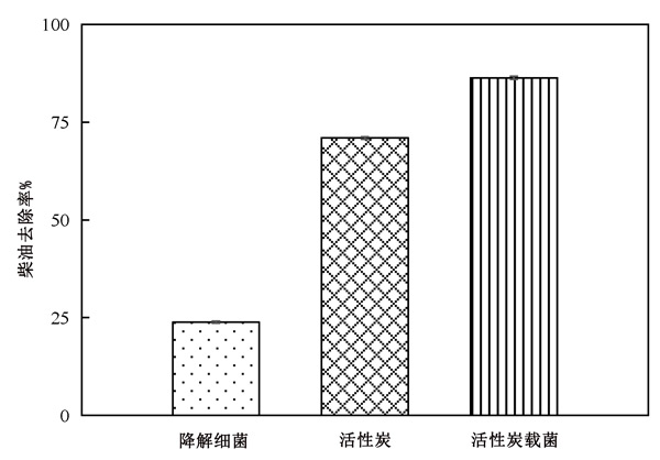 圖3:降解菌、活性炭和活性炭載菌的柴油去除率比較。