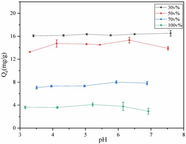圖1:溶液pH對鄰苯二甲酸二丁酯吸附能力的影響。本文圖例中的每個體積分數(shù)為乙醇含量。