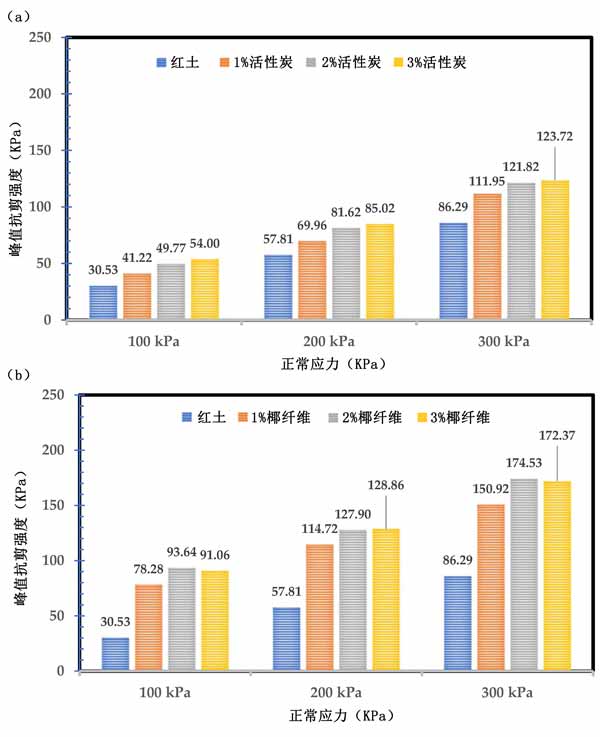 活性炭試樣的剪切強(qiáng)度與剪切應(yīng)變的關(guān)系。峰值剪切強(qiáng)度隨著正應(yīng)力的增加而提高,特別是300kPa正應(yīng)力。此外,添加活性炭增加了峰值剪切強(qiáng)度,并且增強(qiáng)率隨著法向應(yīng)力的增加而增加,如圖4a所示。同樣,添加0.5%的椰殼纖維進(jìn)一步提高了活性炭穩(wěn)定土的峰值剪切強(qiáng)度,如圖4b所示。雖然在天然紅土中添加活性炭會(huì)增加峰值強(qiáng)度,但對(duì)于超過(guò)2%的活性炭,增加率并不顯著。例如,活性炭穩(wěn)定土的峰值強(qiáng)度分別為2%和3%活性炭的121.8kPa和123.72kPa?傮w而言,與本研究的結(jié)果相似。發(fā)現(xiàn)在石灰穩(wěn)定土壤中使用椰殼纖維可進(jìn)一步提高抗拉強(qiáng)度和抗壓強(qiáng)度。還觀察到,椰殼纖維的加入提高了膨脹土中的兩個(gè)剪切參數(shù)。