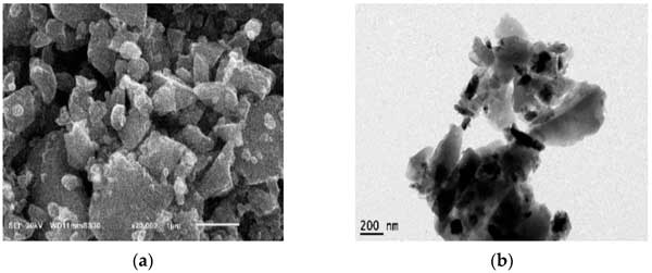 圖1:(a)SEM顯微照片,(b)活性炭納米粒子的TEM顯微照片。