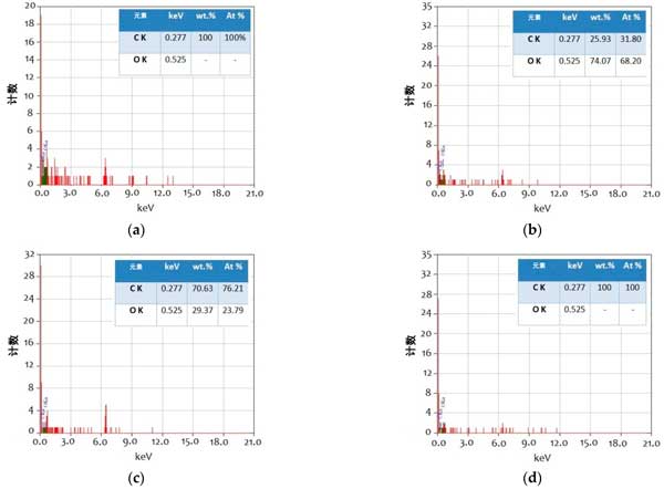 圖4:測(cè)試樣品在500倍放大率下的SEM磨痕圖像的EDX光譜(a)鋰基潤(rùn)滑脂,(b)1wt.%活性炭,(c)2wt.%其他樣品,和(d)0.5wt.%活性炭+2wt.%其他樣品。