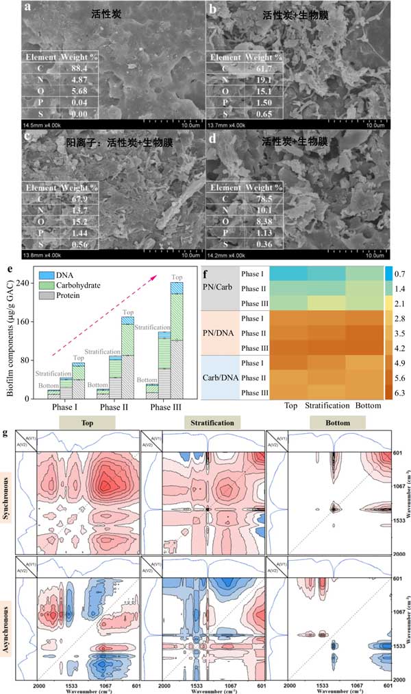 活性炭是生物膜生長(zhǎng)的優(yōu)良載體,它可以快速?gòu)囊合嘀形沼袡C(jī)物和營(yíng)養(yǎng)物質(zhì),用于生物膜中微生物的新陳代謝。圖1顯示了有和沒(méi)有生物膜的活性炭形態(tài)動(dòng)力學(xué)、生物膜組分的濃度和反應(yīng)器不同位置的官能團(tuán);钚蕴恐械脑刂饕ㄌ(C,88.4%)、氮(N,4.87%)、氧(O,5.68%),以及少量的磷(P,0.04%),活性炭表面為比較順利。生物膜形成后,活性炭表面附著大量生物質(zhì),變得更加粗糙。由于生物膜中蛋白質(zhì)、碳水化合物和DNA的積累,包括N、O和P在內(nèi)的主要元素的比例顯著增加(圖1e)。值得注意的是,硫元素也被檢測(cè)到,這應(yīng)該有助于活性炭和生物膜對(duì)LAS(磺酸基團(tuán))的吸附。