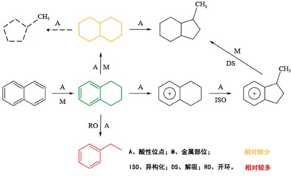 萘在改性活性炭催化劑上的加氫路徑如圖4所示。與氧化鋁催化劑上的類似,活性炭催化劑上的萘在酸性位點和MoS2的共同作用下可以生成四氫化萘和十氫化萘。四氫化萘在酸性位點與烷基苯形成碳鎓離子,然后異構(gòu)化為甲基-茚碳正離子,最后在活性位點解吸成1-甲基-茚滿。同時,四氫化萘在酸性位點受到溢氫作用時,苯環(huán)的α位和γ位斷裂,生成乙苯。通過從酸性位點上的MoS2活性位點溢出氫氣,萘烷進一步加氫裂化為1-甲基-茚滿。與氧化鋁催化劑相比,活性炭催化劑產(chǎn)生更多的四氫化萘和更少的萘烷,這是因為活性炭催化劑比氧化鋁具有更少的酸位。