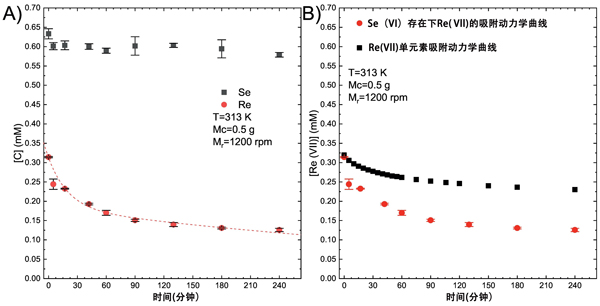 比較了Se(VI)+Re(VII)體系和單獨Re(VII)體系的吸附動力學曲線和吸附容量。得到的結(jié)果如圖1A和B所示,清楚地顯示了動力學曲線和吸附容量的差異。如圖1B所示,Re(VII)和Se(VI)的混合物對Re(VI)的吸附遠高于Se(VI),表明對Re(VII)的選擇性。處理240分鐘后,錸離子濃度從0.3mM下降到0.11mM,這意味著>60%的錸離子被吸附。然而,在硒吸附的情況下,如圖1所示A,Se(VI)的初始濃度(0.63mM)和最終濃度(0.59mM)之間的差異等于0.06%(圖1A)。該值在測量誤差范圍內(nèi),可以忽略不計。在這個過程中已經(jīng)證實了活性炭對Re(VII)的選擇性。根據(jù)獲得的結(jié)果,確定將僅針對Re離子進行進一步的研究工作。