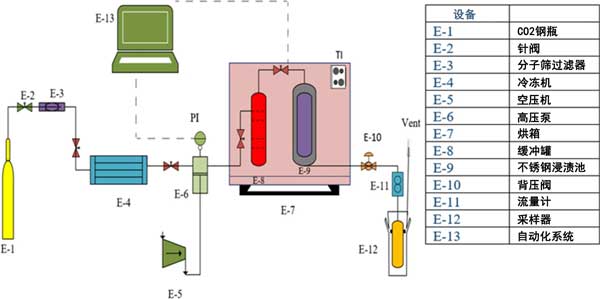首先,來(lái)自儲(chǔ)罐的CO2通過(guò)標(biāo)稱尺寸為1µ的過(guò)濾器,以避免任何雜質(zhì)進(jìn)入工藝路徑。然后,CO2被引導(dǎo)至冰箱單元,其溫度降至-10℃和60bar。液化CO2使用往復(fù)泵加壓,并轉(zhuǎn)化為殼管式配置的調(diào)壓鼓。在這個(gè)鼓中,流體溫度被設(shè)置為適當(dāng)?shù)臏囟纫赃_(dá)到超臨界流體條件。該鼓的設(shè)計(jì)旨在減少波動(dòng),熱交換通過(guò)使用溫度精度設(shè)置為1K的1000W元件循環(huán)水進(jìn)行。壓力表安裝在調(diào)壓鼓的輸出端,以顯示出口流體壓力。之后,液體被引導(dǎo)到裝有10克活性炭和玻璃珠的萃取池。在提取單元的輸入和輸出處安裝了兩個(gè)孔隙率為1微米的過(guò)濾器,以防止顆粒逸出。細(xì)胞中玻璃珠的存在使CO2均勻分布在提取單元內(nèi)。在用SC-CO2加載萃取池后,將萃取池設(shè)置在適當(dāng)?shù)臏囟群蛪毫ο录s45分鐘。在靜態(tài)階段之后,動(dòng)態(tài)階段從打開(kāi)采樣閥開(kāi)始。為了防止閥門(mén)凍結(jié),它被包裹在加熱元件中。在動(dòng)態(tài)時(shí)間內(nèi),使用冰柜將樣品采集溫度保持在0℃以下。每個(gè)實(shí)驗(yàn)一式三份進(jìn)行,圖1顯示了超臨界流體裝置的詳細(xì)信息,通過(guò)將每個(gè)初始活性炭的溶質(zhì)重量除以計(jì)算超臨界回收率。