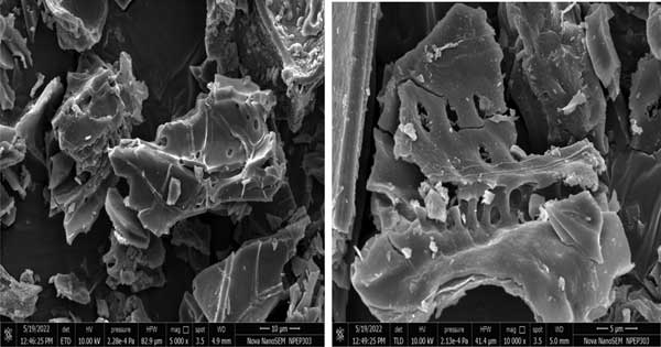 使用掃描電子顯微鏡分析獲得的活性炭的孔結(jié)構(gòu)。SEM設(shè)備具有超高分辨率低電壓成像和獨(dú)特的低真空能力。SEM圖像是在15kV時(shí)以1nm、1kV時(shí)1.4nm、3kV時(shí)1.8nm和30Pa的不同分辨率拍攝的。觀察活性炭的表面物理形態(tài)是通過(guò)使用SEM完成的技術(shù)。圖3顯示活性炭的SEM圖像。這表明活性炭的外表面具有均勻開(kāi)放的大孔。此外,活性炭的表面是高度多孔的,其特點(diǎn)是不均勻。同樣清楚的是,活性炭在其外表面具有微孔和空腔,暗區(qū)位于該處。經(jīng)受碳化后,活性炭由于ZnCl2的蒸發(fā)而產(chǎn)生空隙(稱為氣孔)。可以將這些孔視為通向微孔網(wǎng)絡(luò)的通道。