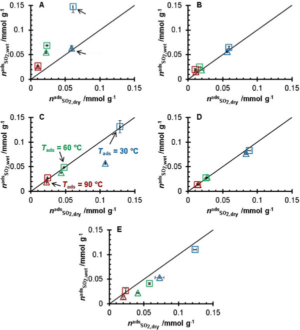 圖1:五種活性炭在濕煙氣與干煙氣混合物中吸附的SO2量。圖中顯示了T=30℃(藍(lán)色)、60℃(綠色)和90℃(紅色)實驗結(jié)果。