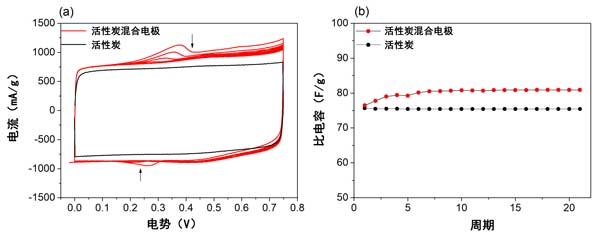 通過評估電化學性能,初步測試了活性炭復合材料作為混合電極的潛在應(yīng)用。為此,通過將浸泡在1M/H2SO4電解質(zhì)中的隔膜夾在兩個相同的電極(活性炭或混合材料)之間來組裝對稱電池。圖3a顯示了活性炭和混合材料在20mV/s恒定掃描速率下的循環(huán)極化(CP)曲線。由于雙電層電容(EDLC)的影響,交流對稱電池的CP曲線形狀為矩形。另一方面,活性炭混合電極觀察到準矩形CP曲線NPs對稱細胞,具有源自納米銀的各種氧化還原波,與矩形(電容)包絡(luò)重疊。這種CP結(jié)構(gòu)表明法拉第和EDLC兩種電荷存儲機制的共存。值得注意的是,隨著循環(huán)次數(shù)的增加,觀察到的銀波變得更小并且變得難以察覺,這表明存在一定程度的不穩(wěn)定,正如對游離多金屬氧酸鹽納米銀所觀察到的那樣。白銀波浪的減少之間存在相關(guān)性(圖3a)在前幾個周期內(nèi),根據(jù)CP面積計算出的比電容有所增加(圖3b)。這可以通過氧化銀薄層與銀的比電容差異來解釋。盡管如此活性炭混合電極的比電容略高于裸活性炭電極,活性炭的比電容為75F/g,活性炭混合電極在20次循環(huán)后達到81F/g。該結(jié)果表明,混合材料具有電活性,并且在對稱超級電容器配置中超過了一定程度的交流電;钚蕴亢突旌想姌O電池的比電容隨著電流密度的增加而降低。對于活性炭混合材料在掃描速率為2mV/s時最高值為83.5F/g,在掃描速率為50mV/s時進一步下降至77.5F/g。高掃描速率下比電容的降低歸因于電解質(zhì)離子的低擴散。由于時間限制,高倍率充放電過程中電解液中的離子運動始終受到擴散限制,僅利用外層活性表面進行電荷存儲。減慢掃描速率可以讓電解質(zhì)更徹底地滲透到孔隙中,并與電極材料的內(nèi)表面有更多的接觸,從而導致電極表面存儲更多的電荷(更大的電容)。