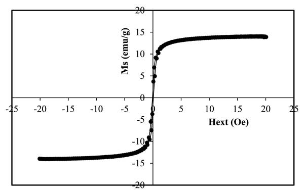 復(fù)合磁性材料的磁性測量顯示出室溫下的超順磁性。圖2顯示了在24.8℃溫度下測量的活性炭磁鐵礦材料的磁滯回線的存在。磁性活性炭的飽和磁化強(qiáng)度(Ms)值為14.06emu/g。磁性復(fù)合材料合成通常會降低純磁性材料的飽和磁化強(qiáng)度(Ms)值。