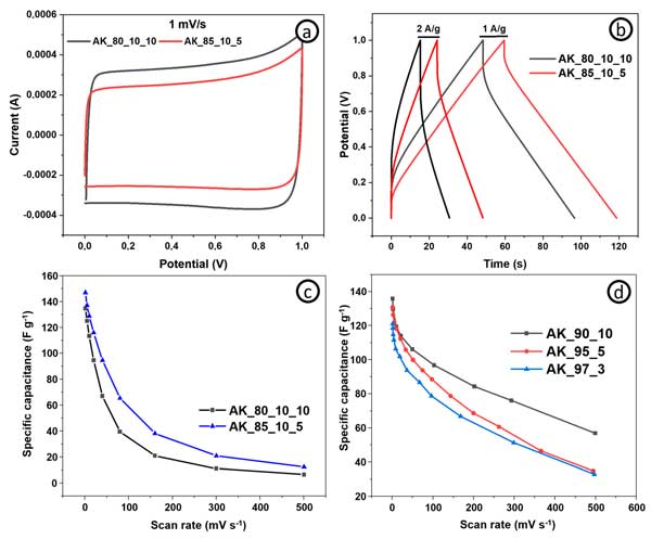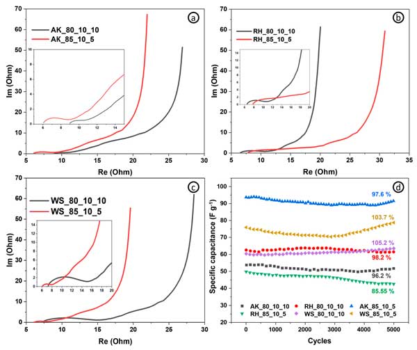 活性炭電極表現(xiàn)出比常規(guī)樣品更好的比電容和能量密度(相同功率密度下的最大能量密度為4.8vs.4.4Wh/kg-1),因為有更多的活性材料,而電阻、倍率能力(圖3c)和功率密度—這取決于電極的導電能力(基于導電添加劑含量)。圖3d顯示了具有不同活性炭和碳納米管含量的電極在不同掃描速率下的比電容。碳納米管含量為10%的電極在1mV/s-1下實現(xiàn)了137F/g-1的最高比電容。從圖中可以清楚地看出,就比電容而言,活性炭和碳納米管的最佳比例為90:10。綜上所述,我們可以得出這樣的結(jié)論:對于超級電容器的自支撐電極,活性成分、結(jié)合成分和導電成分的最佳比例為85:10:5?梢赃M一步評估具有這種含有源自其他生物前體的活性材料的組合物的電極的電化學性能。