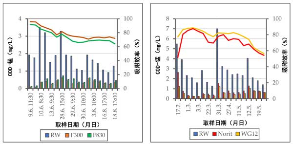 圖3:原水中和處理水中的CODMn濃度以及吸附材料的效率。