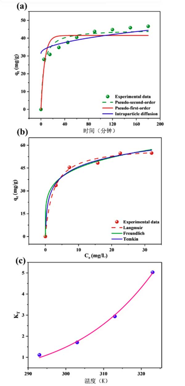 圖3:(a)吸附動力學(xué),(b)吸附等溫線和(c)van't hoff圖,用于吸附Cr上的活性炭上。