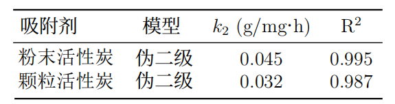 吸附過程符合偽二級動力學模型(R2>0.99),表明化學吸附為主導機制。吸附速率常數(shù)k2隨粒徑減小而增加,反映了粉末活性炭的快速吸附特性(圖2)。