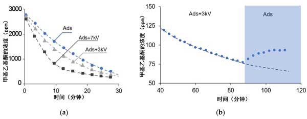圖4:(a)在不存在和存在電場的情況下,甲基乙基酮的濃度。(b)在先打開然后關(guān)閉電場的測試中,甲基乙基酮濃度。