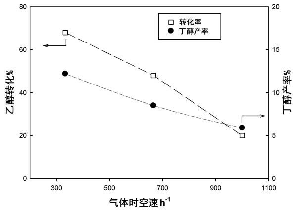 通過改變反應(yīng)器中的活性炭負(fù)載量,同時保持總流速和入口乙醇濃度不變,在400°C下初步研究了氣體時空速度對20%活性炭負(fù)載氧化鎂樣品的影響。結(jié)果以乙醇轉(zhuǎn)化率和丁醇產(chǎn)率報(bào)告于圖3。正如預(yù)期的那樣,乙醇轉(zhuǎn)化率通過降低氣體時空速度而增加。值得注意的是,對于較低的氣體時空速度值,制得丁醇的產(chǎn)率也增加。應(yīng)該注意的是,在我們的實(shí)驗(yàn)中負(fù)載的最大催化劑量(1克)對應(yīng)于約3厘米的催化床高度。更長的催化劑床層將超過電爐的等溫區(qū),因此,未探索出較低的氣體時空速度值。另一方面,即使使用較大可能劑量的催化劑,在350°C下進(jìn)行測試所得到的丁醇產(chǎn)量也可忽略不計(jì)。