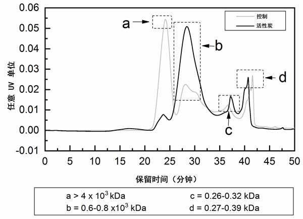 為了檢驗(yàn)活性炭改變可溶性微生物組成,使其對(duì)膜具有更高的親和力這一假設(shè),通過(guò)GPC分析了構(gòu)成可溶性微生物的有機(jī)分子的大小分布(圖1)。在第二次可溶性微生物運(yùn)行結(jié)束時(shí)收集了可溶性微生物樣品(圖1b),有趣的是,GPC色譜圖顯示了對(duì)照反應(yīng)堆和活性炭加入反應(yīng)堆之間的明顯差異。在活性炭反應(yīng)器的可溶性微生物中,保留時(shí)間為24分鐘時(shí),來(lái)自對(duì)照反應(yīng)器的可溶性微生物的第一個(gè)峰顯著降低,而在活性炭反應(yīng)器的可溶性微生物中,在28分鐘時(shí)觀察到峰的上升(圖1,分別是峰值a和b)。活性炭反應(yīng)器的可溶性微生物中的37分鐘處的峰也升高(峰c)?扇苄晕⑸镏心承┯袡C(jī)化合物含量的變化(升高或降低)可能歸因于,由于微生物群落組成的變化或某些活性炭所觀察到的代謝活性增強(qiáng),導(dǎo)致某些微生物產(chǎn)品的產(chǎn)生和分泌增加另外,或抑制進(jìn)水橄欖油廢水中物質(zhì)的降解。有機(jī)化合物對(duì)活性炭顆粒的吸附只會(huì)降低其在可溶性微生物中的外觀。由于吸附到活性炭上,可溶性微生物中某些成分的減少(如峰a所示)也有可能優(yōu)先吸附其他成分,這些成分對(duì)通量的減少更不利,或者起膜調(diào)節(jié)前體的作用,這可能會(huì)增強(qiáng)生物膜的生長(zhǎng)(例如峰b–d)。顯然,確定膜上有機(jī)污染物的身份是一項(xiàng)必不可少的任務(wù),目前,尚不清楚不同可溶性微生物組分對(duì)膜污染的詳細(xì)影響以及它們被活性炭的吸附。