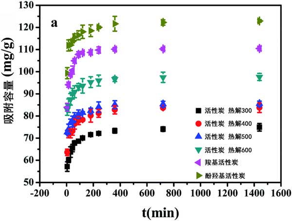 大量研究表明,有機污染物在水介質(zhì)上的吸附包括分配和吸附作用。為了評估在活性炭上吸附化合物時在碳化相中的吸附和在非碳化相中的分配的貢獻,雙模式模型在該研究領(lǐng)域中被成功引用。通過雙模式模型計算了多菌靈在不同濃度的活性炭上的分配和吸附。在該實驗中,雙模型為所有樣品的等溫線提供了良好的擬合(圖3)。在本研究中,所有活性炭上多菌靈的吸附均大于分配所有多菌靈濃度的吸附。但是,隨著多菌靈濃度的增加,分配(Q p)和吸附(Q ad)對總吸附的貢獻也不同。在低濃度范圍內(nèi),吸附大于在活性炭上的分配,并且Q ad值貢獻超過總吸附的97%。但是,在高濃度范圍內(nèi),多菌靈對不同樣品在整體吸附中的分配和吸附的貢獻不同。當多菌靈的濃度達到300 mg L-1時在熱解300、400、500攝氏度的活性炭上,吸附對總吸附的貢獻仍然遠遠大于分配作用。盡管活性炭中含O官能團的含量逐漸減少,但分配對總吸附的貢獻率卻逐漸增加,特別是對于羧基活性炭和酚羥基活性炭,它們的Q p值分別達到39.4%和44.13%。主要原因可能是樣品表面上含O官能團的減少導(dǎo)致更好地暴露于樣品表面和多菌靈濃度增加,從而導(dǎo)致吸附過程飽和。因此,多菌靈可以分配給非碳化相。