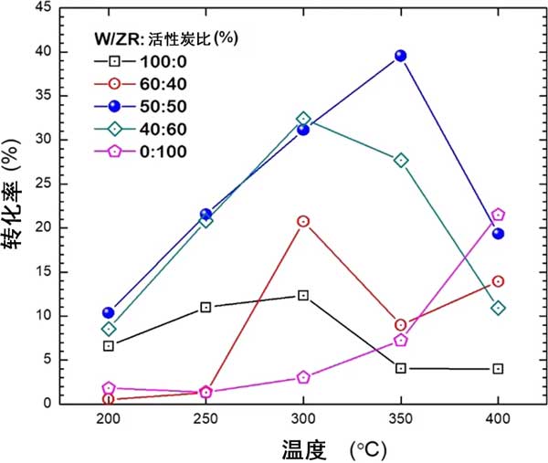 在第一部分中,我們比較了活性炭和氧化鋯單載體系統(tǒng)之間的性能;钚蕴繂屋d體顯示出高的重量比表面積,但仍低于合成為催化劑的活性炭。此外,其酸度高于氧化鋯的酸度,這被認(rèn)為有利于酸催化的反應(yīng)的活性。在圖1中,單載體催化劑的比較表明,在450-C的溫度下,W/ZR的轉(zhuǎn)化率高于W / 活性炭,而W / 活性炭在450°C時的轉(zhuǎn)化率比W/ZR高。W/ZR:活性炭的60:40和40:60在300°C時表現(xiàn)出最大的轉(zhuǎn)化率,分別約為21%和33%。我們發(fā)現(xiàn),最高的轉(zhuǎn)化率是由350:50的50:50 W/ZR:活性炭催化劑產(chǎn)生的。